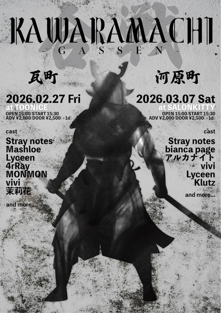 KAWARAMACHI合戦 Day2 SCHEDULE 2026/03/07(土) 前売 ¥2,000 当日 ¥2,500(+1drink) Open 15:00/Start 15:30 URLをコピーする 報告する